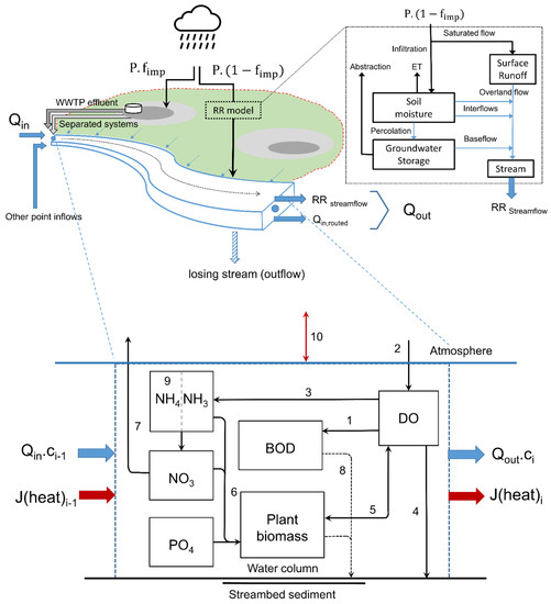 Conceptual model structure for a single reach encompassing the key hydrological (upper) and in-stream water quality (lower) processes. Key interconnecting processes for water quality given as numbers include: (1) carbonaceous biochemical oxygen demand, (2) reaeration, (3) nitrification, (4) sediment oxygen demand, (5) photosynthesis/autotrophic respiration, (6) nutrient assimilation, (7) denitrification, (8) settling, (9) ammonium/ammonia partitioning (pH-dependent), and (10) water-atmosphere heat exchange. All processes are temperature-dependent. Abbreviations are defined in the related Section 2.2.1 and Section 2.2.2.