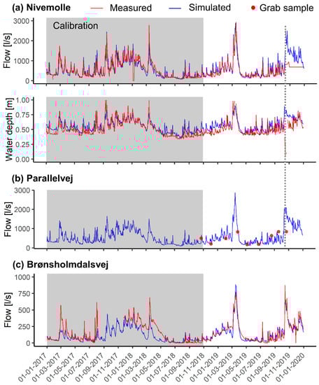 To demonstrate the model applicability, results for both the calibration and verification period are shown for various water quantity and quality indicators in the following sections. Taking advantage of the numerous stream gauging stations in the catchment, results could be shown for four locations along the Usserød stream (Grønnegade; Ådalsvej, Parallelvej, Nivemølle) and two locations along the Donse Tributary (Fredtoften, Brønsholmsdalsvej), listed here in order from up- to downstream flow locations along each water course (Figure 2). Results have been selected to show the versatility and transferability within the catchment, as well as the model performance. In terms of water quality, Parallelvej (Usserød Stream) is shown for DO, the location of the sensor; else results are shown according to the outlets for the three reaches comprising the Usserød catchment (Grønnegade, Ådalsvej, Nivemølle).