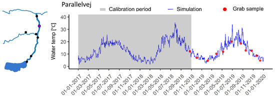 Simulation results for the stream temperature compared to grab sample measurements at Parallelvej (red marked circle in map). The grey ribbon indicates the calibration period for the RR model, the rest of the time series being the verification.