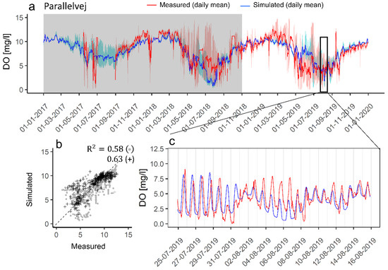 DO concentration simulation (blue line) compared to an online sensor measurement (red line) at Parallelvej, with (a) simulated and measured daily mean DO concentration for the calibration and verification period. The grey ribbon indicates the calibration period. The pale blue and red shadings correspond to the amplitude of simulated and measured daily extremes, respectively. (b) 1:1 scatter plot of simulated and measured daily average DO concentration (black cross-marker corresponds to the verification period, grey dot marker to the calibration period); and (c) simulated and measured hourly DO for a selected summer period showing the diurnal variation induced by plant photosynthesis/respiration.