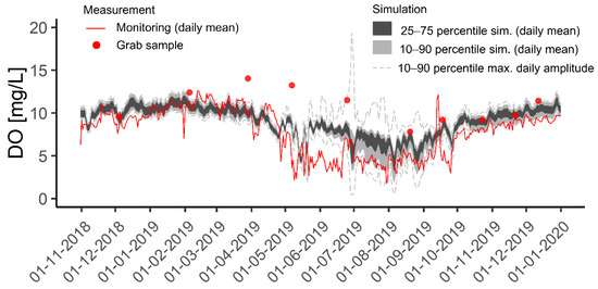 MC simulation results at Parallelvej for the DO concentration (gray and black shading/lines) compared to the online sensor (red line; located under a bridge in the shade) and grab sample measurements (red circles, measured in the afternoon) j. The results are shown for the verification period only. The gray and black shadings show the 10–90 percentiles of estimated daily DO concentrations. The dashed grey lines show the 10–90 percentiles of maximum daily amplitude resulting from photosynthesis/respiration. Input parameter distributions can be found in Table S5.