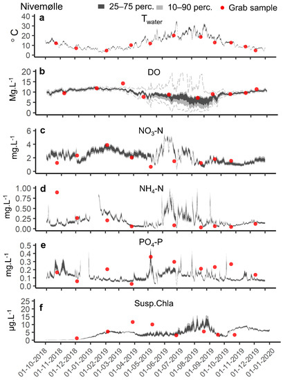 Finally, the model simulation for suspended chl-a compares relatively well with the few available observations, and despite the lack of data and characterization of the suspended algae species assemblage in the stream (Figure 8f). The simulations in the different reaches show that an important part of the suspended chl-a actually originates from the most upstream reach, likely as an output from the eutrophic lake (Figure S15). At the most downstream station, Nivemølle, the percentile range for the simulations clearly shows an underestimation of the suspended chl-a in spring (March–May), coinciding with the aforementioned underestimation of DO concentrations by our model (Figure 6a and Figure 7). These remarks (combined with the high density of emergent aquatic plants observed in this reach) support the assumption of an epiphyte or benthic algae community development at that time, possibly washed away by the stream water flow. Similar observations were made in shallow stream systems in the same country, with epiphyte and benthic microalgae bloom from March to April lost later in the season during high flow episodes [88].