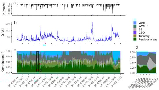 Simulations of the contribution of the different flow components at Nivemølle. (a) Measured precipitation in the model area; (b) Simulated flow in Usserød Stream, (c) Simulated flow contribution for the key features captured by the model; and (d) zoom to highlight a CSO event. The contribution is based on the sum of all inflows (lake (blue); flow from pervious areas (dark green); tributaries (light green); various urban features (WWTP: dark grey; SS: light gray)) and does not account for possible loss along the reaches. (d) Selected time period showing the contribution of a CSO event (purple shading).