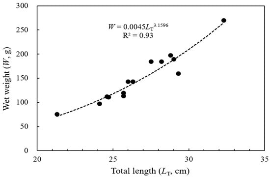 The TS measurements were conducted from August to October 2016 in a seawater acoustic tank (5 m (L) × 5 m (W) × 5 m (H)) at the Fisheries Science Institute, Chonnam National University, located on the south coast of South Korea. To conduct TS measurements on dead fish of various lengths (n = 14), the total length LT range was 21.3–32.3 cm (mean = 26.7 cm), and the wet weight W range was 75.5–269.8 g (mean = 150.2 g). The LT–W relationship can be expressed as Equation (1) (Figure 1).