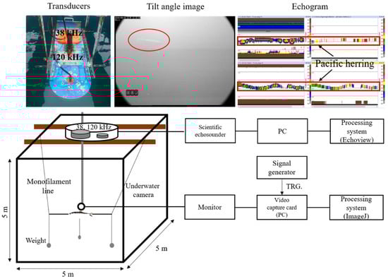 Figure 2 illustrates the experimental setup and system used in the experiment. A scientific echosounder (EK60, Simrad, Kongsberg, Norway) was used to measure the TS of Pacific herring at 38 and 120 kHz (split-beam), and an underwater camera (T-water-7000DX, WIRELESS TSUKAMOTO, Suzuka, Japan) was used to observe changes in the tilt angle. A video capture card was connected to a signal generator (WF1944A, NF Electronic Instruments, Yokohama, Japan). A square wave trigger signal was created by the signal generator, the pulse interval was controlled by an external trigger (0.5 s), and the images were saved on a computer using the video capture card (VCE-Pro, ImperX, Boca Raton, FL, USA). The ping interval of the scientific echosounder was also set to 0.5 s to synchronize with the tilt angle. The fish were tethered using long, weighted monofilament lines attached to the mouth and tail (Figure 1). It is difficult to adjust the tilt angle of dead fish; thus, a weighted monofilament line was connected to the ventral portion of the body so that the herring stayed 3.5–4.0 m below the transducers.