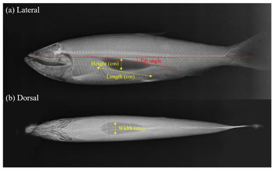 The Kirchhoff-ray mode (KRM) model [] was used to calculate the theoretical TS of Pacific herring. The KRM model combines the breathing mode and Kirchhoff approximation to estimate the intensity of reflected sound based on the sound speed and density contrasts among water, the fish body, and swim bladder []. This model presents the fish body and swim bladder as a fluid-filled and gas-filled cylinder, respectively. The same Pacific herring used in the ex-situ measurements were used in the KRM model. X-rays of the dorsal and ventral aspects were taken (Figure 3), and a digitizing software (GetData Graph Digitizer V 2.26; http://getdata-graph-digitizer.com, Release date: 19 June 2013) was used to separate the body and swim bladder by 0.2-mm slide spacing on the lateral and ventral sides to determine the coordinates of the body contour. The TS was calculated as reduced scattering lengths (RSL), a nondimensional, linear measurement. RSL is equivalent to the square root of the backscattering cross-section (σbs, m2) divided by the length of fish in meters []. RSL is converted to TS and length (LT) using