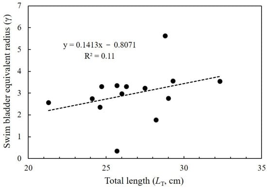 The TS of fish is greatly affected by the size of the swim bladder; thus, the relationship between Pacific herring LT and the swim bladder equivalent radius was investigated (Figure 4). The swim bladder equivalent radius (r) is calculated as r = (length × height × width)1/3 [], where the length, height, and width refer to the dimensions of the swim bladder. The swim bladder equivalent radius increased as LT increased, but the correlation coefficient was not significant.