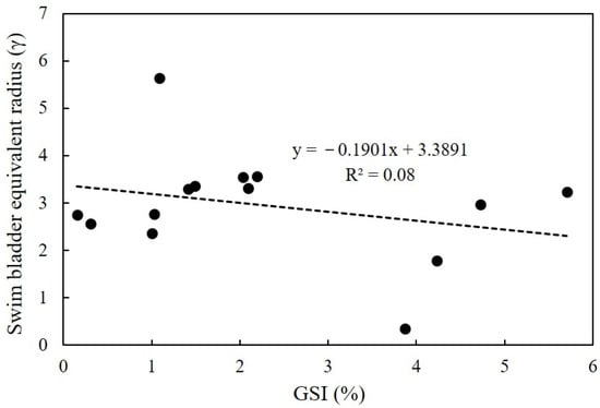 Studies have shown that the herring swim bladder is affected by the body fat composition and gonad size [,]. The relationship between the swim bladder equivalent radius and gonad somatic index (GSI) is presented in Figure 5. GSI is calculated as GSI = gonad weight × 100/(weight–gonad weight). The swim bladder equivalent radius decreased as GSI increased, but the correlation was non-significant.