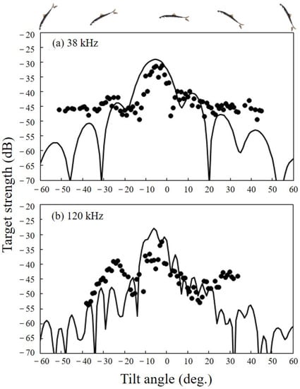 The relationship between TS and the tilt angle is also important [,]. The TS range of the ex-situ measurements with variable tilt angles (−20° to 20°) was 7.7–20.2 dB at 38 kHz and 11.0–20.6 dB at 120 kHz. The mean TS was calculated at a tilt angle of 3.8° (±6.0°) for Clupea harengus: A tilt angle of 3.8° (±6.0°) was used for daytime and −3.2° (±13.6°) was used for nighttime []. Norwegian spring-spawning herring aggregate during the day; the average swimming angle is approximately horizontal, and positive swimming angles up to 40° were recorded at night []. For herring measured at 1.5- and 4-m depths: The tilt angles were –3.9° (±12.8°) and 0.2° (±11.9°), respectively []. The tilt angle of Pacific herring has not yet been reported in situ.