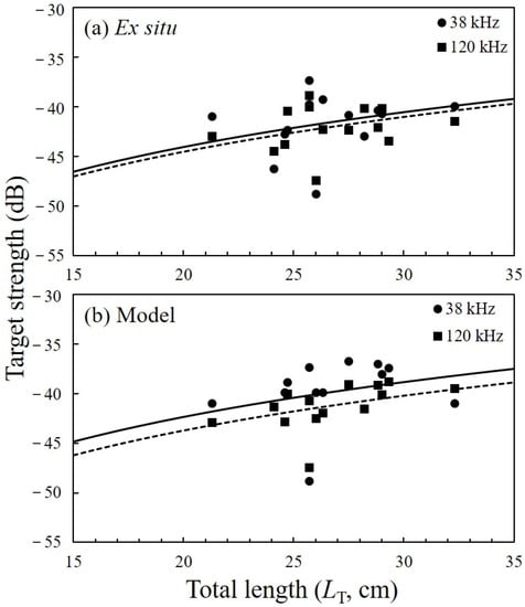 The TS–LT relationships of the regression equations (20 log10(LT) + b20) at 38 (solid line) and 120 kHz (dashed line) using the (a) ex-situ and (b) theoretical model methods.