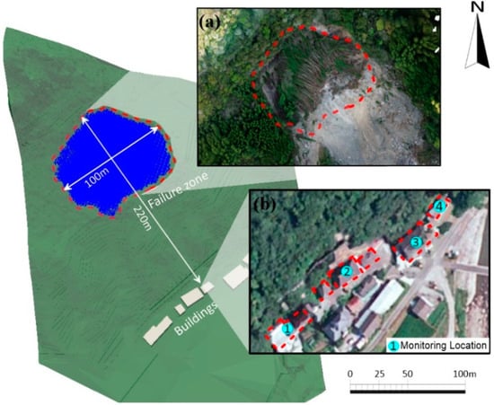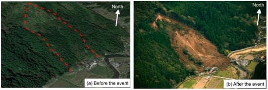 Overview of the 11 April landslide event in Nakatsushi city, Oita, 2018. (a) Before the event. Photo taken at 15 April 2016, from Google Earth. (b) After the event. Photo provided by Japan Asia Group.