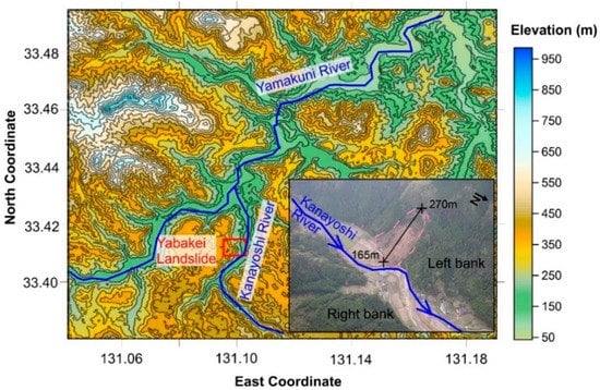 The area is located at the left bank of Kanayoshi River, 2.7 km away from the junction of the first level tributary, Yamakuni River. The hilly mountain has an elevation ranging 150 m–350 m (as shown in Figure 4). Owing to the alluvial deposit of the right-side bank, the cross-section of Kanayoshi River is compressed, forming an obvious river bend to the left-side bank. The regional geomorphology was significantly affected by the volcanic activities in the Pleistocene, Quaternary.