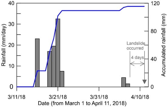Rainfall data were recorded by AMeDAS (Automated Meteorological Data Acquisition System) at Yabakei station, which is approximately 5.0 km from the site. According to the historical rainfall data between January 2009 and April 2018, the maximum monthly rainfall intensity 947 mm was reported on July, 2012. The 24-h rainfall strength of the past 30 days before the landslide event is documented in Figure 7. It is illustrated that no rainfall was observed accompanying with the landslide occurrence. The antecedent rainfall was reported 4 days before the event; rainfall intensities of 4.5 mm and 1.5 mm were recorded on 6 April and 7 April respectively.