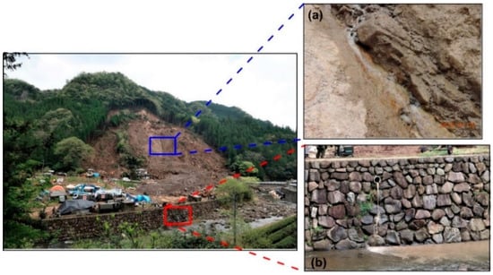 The catastrophic Yabakei landslide collapsed suddenly without any alarm sign. It is a quite typical case in view of that no earthquake or rainfall was recorded accompanying the landslide occurrence. The mechanism of this landslide can be explained in part by the geological settings because four major fractures in the welded tuff were identified in the post-event survey. The antecedent rainfall 4 days before the event resulted in the water infiltration into the fissure of the highly fractured rock mass, causing the long-term effect of soil water on slope destabilization []. The perched groundwater was leaking out of the fractures in the weathered meta-sediment rock, accordingly increasing the water content of the surface near the slope failure, as well as the potential possibility of landslide occurrence []. Pieces of evidence of the perched groundwater are supported by the measurement of water outflow discharge in the post-event survey (as shown in Figure 8). In this sense, the slope failure of this case had a close relation with perched groundwater in the fissure of the fractured sediment rocks, and the rise of the groundwater table in the slope and the loss of the inbound shear strength of the soils can be explained (Figure 9).