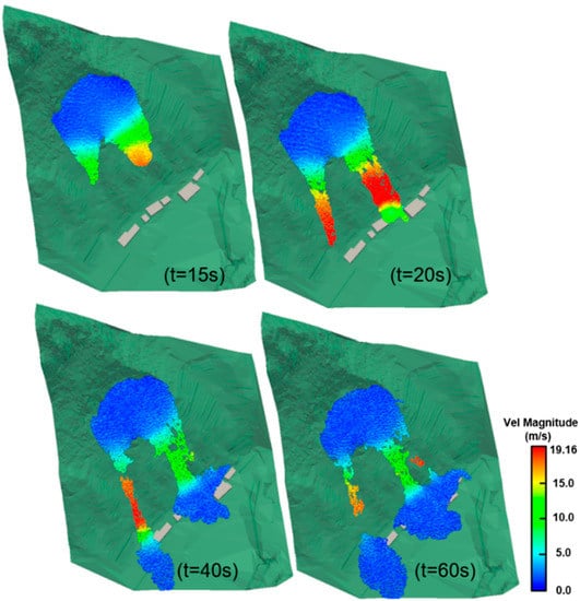 The simulation results of dynamics of this landslide case by HBP-SPH method were beneficial to analyze the impact force exerting by landslide mass. We used the following empirical-based equation (Equation (8)) to calculate impact force, where impact force is a function of particle velocity and its density. Although Equation (8) is empirical-based, it has been widely applied in many previous studies, e.g., [,,,].