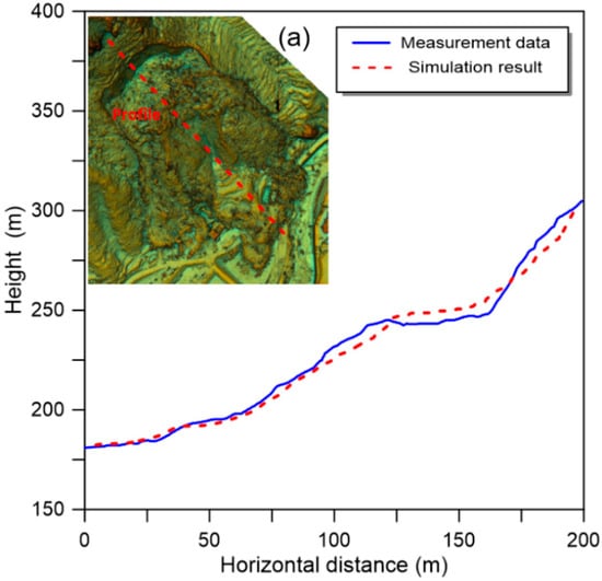 The simulated time-elapsed results of landslide dynamic behavior during the process are shown in Figure 11. Especially the complex destruction process that the landslide mass contact and impact the residential buildings downslope. Figure 12 presents the variation of the main section of the slope after the landslide, showing the comparison between the measurement data and the simulation results. The results demonstrate that the impact range of this landslide was about 75 m in the vertical direction, and about 200 m in the horizontal direction. The dynamic simulation results also demonstrate the dynamics of the landslide at each time step. The failure mass passed through the sliding area and impacted the buildings within 17 s of initiation, with a maximum impact velocity of 19.16 m/s.