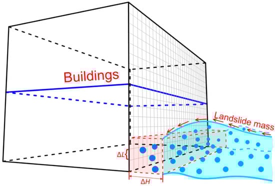Recently, the SPH methods have been applied for problems with computational fluid dynamics for free surface flow and large deformation. The method has been proved to have robustness and reliability in solving integral equations or partial deviation equations [,,]. One growing concern of the SPH method in landslide dynamics simulation is with respect to the rheology model, that the commonly used Bingham model should be suitable for the fluid-kind materials. In this aspect, many previous studies attempted to incorporate different rheology models, e.g., the general Cross model [,], the Herschel-Bulkley model (HB) [,], and the Herschel-Bulkley-Papanastasiou (HBP) [,] to describe the rheological behavior of landslide mass. Another key issue of the SPH method is regarding to the representation of the landslide dynamic. Landslide mass in the SPH scheme consists of a large amount of particles with complex velocity vectors and dispersed locations in three-dimensional coordinate system. Therefore, a rational representation of the landslide dynamic is necessary. To address this issue, we proposed a novel surface cell-based model, i.e., the so-called SC-HBP-SPH model [], in which the space is meshed, over which the SPH particles belonging to a certain cell at each time step are identified to represent the dynamics such as velocities and mass depths. This method also benefits the analysis of the time-elapsed variation of landslide mass impact. Consequently, in the past years, SPH was used in landslide modeling [,,,]. The results indicate that the SPH is robust and reliable in modeling the fundamental dynamic behavior of mass flows. Therefore, HBP-SPH was adapted in this work to investigate the influence of landslide mass on the impact pressure in building.