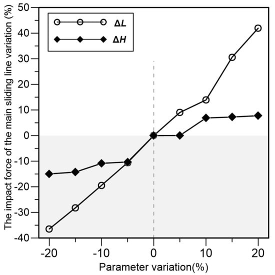 In order to extract the general velocity and impact of SPH particles, the surface-based algorithm from our previous method [] was applied. However, in this case, we noticed that the extracted impact forces were sensitive to some manipulated parameters, in particular, the distance of impact contact surface and surface cell size as shown in Figure 13. Herein, a one-at-a-time sensitivity analysis was performed to assess the impact of input parameters’ variation on the impact force. The 2# data along the main sliding profile were used. The initial parameters are listed in Table 2. All the initial parameters were kept constant except the one chosen for sensitivity analysis. The given parameters generated the maximum impact force on the main sliding line, being 4224.89 kN. Figure 15 shows the reproduced landslide impact force as a function of the chosen parameters. The figure demonstrates that the distance of impact contact surface has good robustness to the maximum impact force on the main sliding profile. Since the impact force of the grid was calculated based on the maximum velocity of particles in the scope of the calculation code, we determined that the variation of the maximum impact force is between −36.47% and 41.97% on the main sliding line when the surface cell size varied ±20%. In summary, surface cell size is a key parameter in the SC-HBP-SPH method, and a trial-and-error adjustment is required to obtain its best-fitting value.