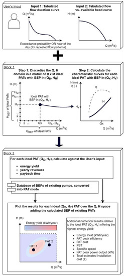 The fundamental concept at the core of the software is the best efficiency point (BEP) of a PAT, described as the coordinates in terms of flow Q (m3/s, unless otherwise stated) and head H (m) at which the device operates at peak hydraulic-mechanic conversion efficiency. The functionality of the software is described in the following sub-chapters and is summarized in Figure 1.