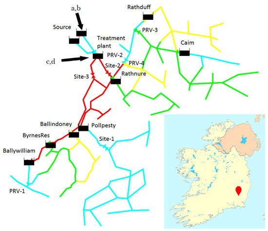 The Blackstairs Group Water Scheme is a community-owned water network located in Co. Wexford, Ireland, whose geographical position and pipe layout are displayed in Figure 2. It supplies an average of 1500 m3/day to 1072 clients through 117 km of water pipes (source: direct communication, 2017). It is served by a single water treatment plant (WTP) positioned at an altitude of 211 m a.s.l. that is fed via four separate supply lines of which one is pumped and the remaining three are gravity-fed. Among these, the supply line with the most pressure is a DN150 2-km long pipe conveying water from the source, in particular, the so-called “Connells intake”.
