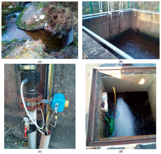 Portions of the Connells supply line. (a) River intake with screening mesh. (b) Settling tank at the start of the penstock. (c) The base of the raw water storage tank at the WTP, with visible on/off automated butterfly valve. (d) Water flow entering the tank.