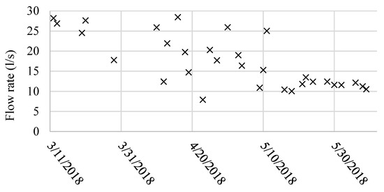 In the absence of hydrological data on the stream feeding the Connells intake, a flow meter was installed on the same supply line and readings were manually taken by the site maintenance staff between 12 March, 2018 and 8 June, 2018, as depicted in Figure 4. Each of the data points presented in Figure 4 corresponds to the manual reading from the flow meter display that the site maintenance staff took while entering the WTP and annotated on a paper register.