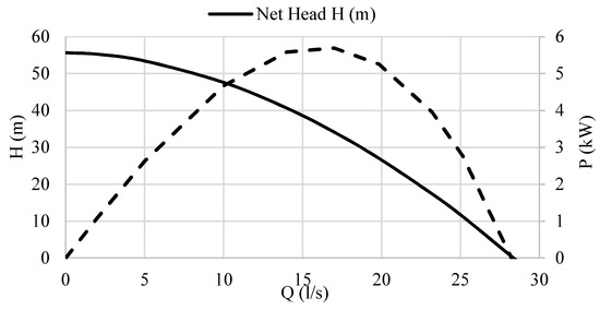 where P (W) is the power output; ρ is the water density (1000 kg/m3); g is the gravitational acceleration (9.81 m/s2); H (m) is the net available head; and Q (m3/s) is the flow rate. The profile of resulting available power vs. flow rate is also displayed in Figure 5.