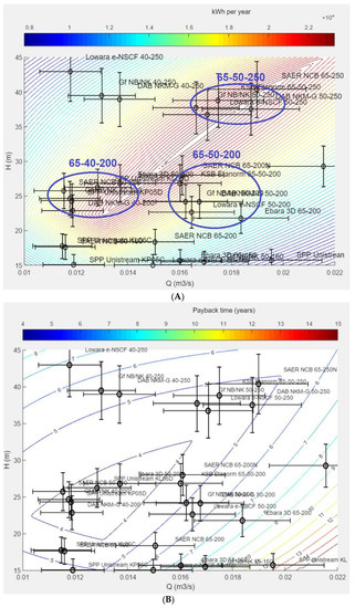 The second block of the software, as schematized in Figure 1, analyses the user’s inputs and calculates the results in terms of expected yearly energy yield and simple payback time for all ideal PATs whose BEP lies in the B × M matrix. The software generates a 2D contour chart in which each point represents a hypothetical turbine whose BEP corresponds to the Q (m3/s) and H (m) coordinates shown on the horizontal and vertical axis, respectively. At the same time, it shows which real-world off-the-shelf available PAT best approximates the optimal “ideal” PAT.