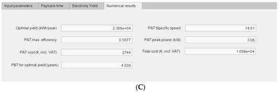As seen in Figure 6A,C, the maximum energy yield (23,560 kWh/year) would be obtained by an ideal PAT with a BEP of 16.6 l/s and 33 m. As seen in Figure 6C, such a PAT would cost around € 2700 inclusive of VAT and generate up to 3.08 kW.