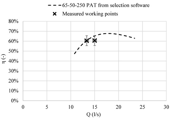 Apart from a few outliers, the families of standardized PATs that offer the closest performances to the ideal one are the 65-50-250 (Figure 6A, top-right), the 65-40-200 (Figure 6A, bottom-left) and the 65-50-200 (bottom-center of Figure 6A). However, considering the uncertainty in the BEP determination shown as horizontal and vertical error bars in Figure 6A, it can be noted that the 65-50-250 family of standardized pumps is the safest choice since it sits on a wide plateau with an expected energy yield in excess of 20,000 kWh/year.