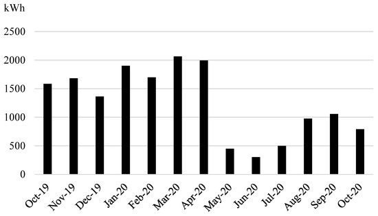 As shown in Figure 10, over the first 12 months of operation, the PAT generated 15,559.12 kWh, which corresponded to € 2036.43, according to the electricity value calculated through Equation (4). This was slightly lower than the predicted 21,000 kWh per year, as seen in Figure 6A, which was due to the dryer-than-usual 2020 spring period from May onwards. Additionally, since the flow duration curve used as an input, as described in Section 3.2.1, was not based upon a rigorous and time-consuming flow measurement campaign at the river intake, the flow duration curve entered in the software was only an approximative one.
