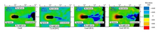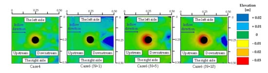 Figure 2, Figure 3, Figure 4 and Figure 5 show the distribution of the local scour depths after the water penetration test. Incidentally, black areas in pictures are the pier model or elevation data areas that could not be obtained. In each case, a formation of ripple was observed downstream of the pier model, however, no ripples were observed near the upstream of the pier model, indicating that the effect of ripples on the formation of local scour holes was small. Figure 2 shows the distribution of local scour depths at the first, fifth, and tenth cycle of water penetration in Cases 4 and 6, where the water level was iteratively raised and lowered. Figure 3, Figure 4 and Figure 5 show the distribution of local scour depths for Cases 8 to 13, where Cases 9, 11, and 13 are representative of the distribution of local scour depths for the first, fifth, and tenth cycle of water flow. The contour map of the cylindrical and oval specimens show areas of 500 mm × 500 mm and 500 mm × 750 mm from the top of the soil layer, respectively. The contour plot of the local scour depth is shown in yellow to red as a negative value for the area where the ground height is low and in blue as a positive value for the area where the ground height is high, using the height of the soil layer as the reference plane.