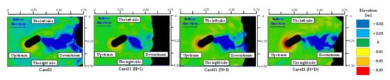 In Case 4, the formation of a local scour hole of an inverted cone and sedimentation zone were observed upstream and downstream of Type 1 model, respectively, as shown in Figure 2. It was consistent with the formation reported in previous studies [,]. In addition, we observed that the local scouring process started from the diagonal upstream and progressed to the surrounding area along the wall of Type 1 model to form a local scouring hole, similar to that in the experiment conducted by Umeda et al. []. As shown in Figure 2, the local scour depth distribution in Case 6 shows that the range of the local scour hole upstream of the bridge pier model increases as the water level rises and falls iteratively.