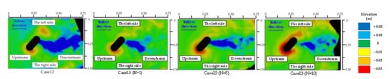 For Cases 10 and 11, as shown in Figure 4, local scour holes were formed on the right side of the upstream (hereinafter referred to as the right side) and the left side of the downstream (hereinafter referred to as the left side) of the bridge pier model. In addition, a sedimentation zone with the same width as that of the water flow obstruction was observed downstream of the bridge pier model. This could be due to the placement of Type 2 model at an angle of θ = 30° with the water flow direction, which resulted in a wider deposition area in the perpendicular direction of the open channel compared to the circular specimen or the oval specimen with an angle of θ = 0° with the water flow direction. Case 11 shows that the local scour hole formed upstream of Type 2 model expanded as the water level iteratively rose and fell, and the local scour area extended to the left side downstream of Type 2 model. In addition, the local scour depth contours of Cases 12 and 13, as shown in Figure 5, show that the upstream local scour shape was formed on both right and left sides downstream of Type 2 model. Moreover, a sedimentation zone with the same width as that of the water flow obstruction was formed downstream of the bridge pier model, indicating that the sedimentation zone was extensive, similar to that in Cases 10 and 11. Further, in Case 13, the range of the local scour hole formed upstream of the bridge pier model increased as the water level rose and fell iteratively, and the local scouring extended downstream of the oval specimen more widely than that when θ = 30° at the left side. This tendency was similar to that of the experiments previously conducted by the authors and other researchers [,,].