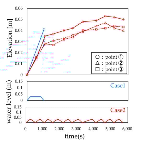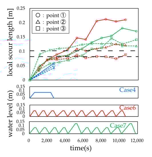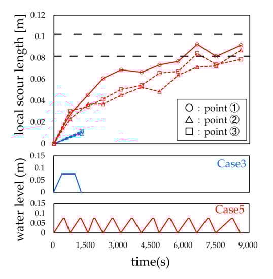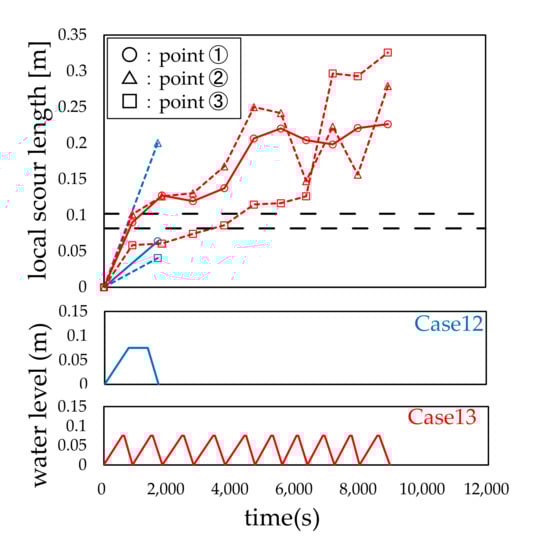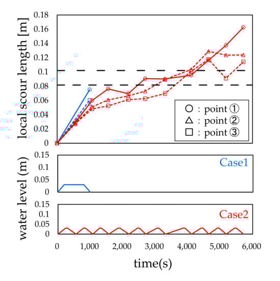 Figure 7, Figure 8, Figure 9, Figure 10, Figure 11 and Figure 12 show the relationship between the water level history and local scour depth. From these figures, it can be observed that the local scour depth increases as the water level rises and falls iteratively, and that the increase tends to converge after the third or fourth water flow. The local scour depth of each measuring point tended to be the largest at measuring point 1 in all cases. The local scour depth at point 1 was approximately 1.2 times larger than that at points 2 and 3. The local scour depths were 1 to 1.5 times the width of the bridge piers. These experimental results are consistent with those of previous studies [,,,,,]. For Cases 1 and 2, the local scour depths, shown in Figure 7, were similar to the values calculated through the model proposed by Tarapore []; the calculated local scour depth was 43.5 mm when the water flow rate was 0.03 m.