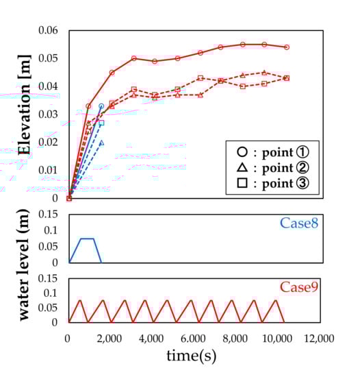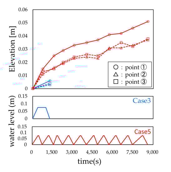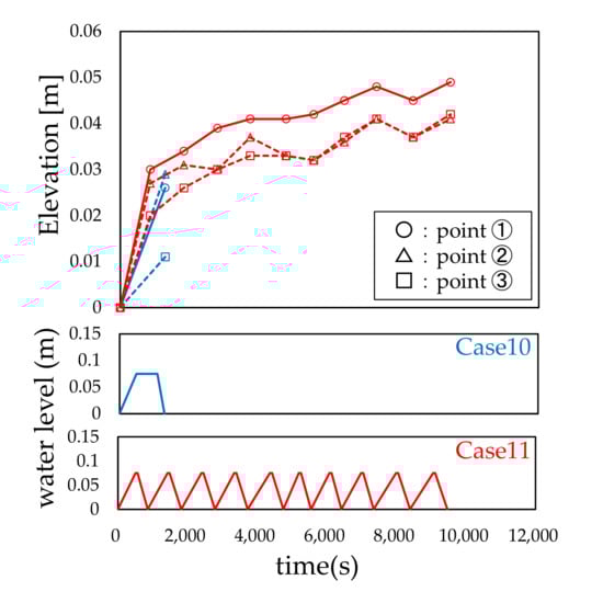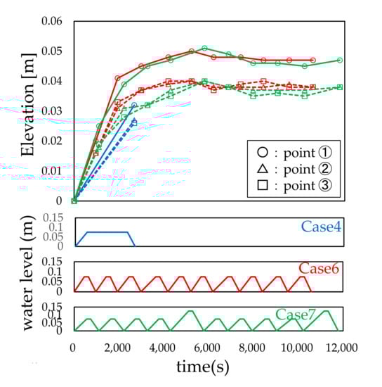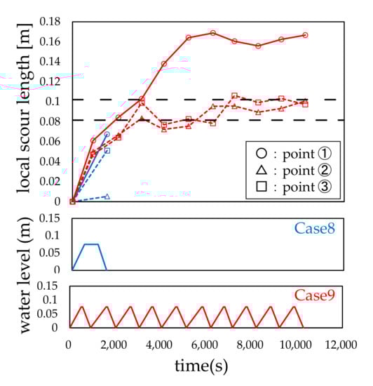 Figure 7, Figure 8 and Figure 9 show that the local scour depth increased with the repetition of the water level, and the convergence tendency was similar in all cases, although the water level was different in each case, and the local scour depth at the tenth cycle was almost the same. Therefore, it can be concluded that the effect of the change in the target water level on the local scour depth was slight, and the water level history caused by the iterated rise and fall of the water level affected the local scour depth.