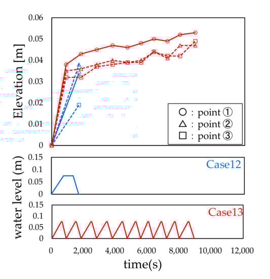 The results of Cases 8, 10, and 12, where the water level did not rise and fall iteratively, show that the local scour depth at measuring point 1 was the largest in Case 8, while at point 2, it was the largest in Cases 10 and 12. This result was similar to that of a previous study []. From the experimental results of Cases 9, 11, and 13, where the water level rose and fell iteratively, it was observed that the local scour depth increased to the maximum at measuring point 1 when θ was 0°, 30°, or 45°. However, the maximum local scour depth was the same as that of Type 1 model in all cases. Further, the location of maximum local scour depth changed from point 2 to the vicinity of point 1 when the water level history was iterated. In general, when θ was specified, the local scour holes were formed at the vicinity of point 2, followed by point 3 and point 1 []. When the water level did not rise and fall iteratively, the maximum local scour depth was observed in the vicinity of point 2; however, the position of the maximum local scour depth shifted to point 1 owing to the rise and fall of the water level. This was probably due to the inflow of water from upstream into the scour hole that occurred when the water level rose or fell.