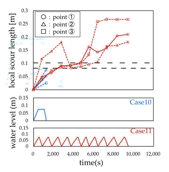 Local scour depth of Cases 10 and 11.
