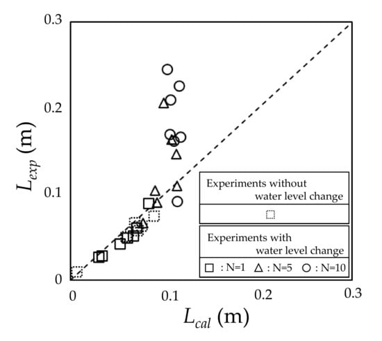 Figure 19 shows the relationship between the calculated value of Lcal obtained by Equation (1) using Φ = 26.1° and the experimental value of Lexp. Figure 19 shows the results for point 1, which was considered to be the most affected by the water level history, and the representative results for the first, fifth, and tenth cycle are shown for the cases with iterated water level history. Figure 19 shows that the Lcal and Lexp values are generally the same for the case where the water level does not rise and fall iteratively and for the first repetition. This indicates that the slope of the local scour hole and straight line connecting the start and end points of the local scour length were approximately equal to the angle of repose in water. In addition, Figure 19 shows that Lexp is larger than Lcal at the end of fifth and tenth repetitions. This indicates that the angle of the straight line connecting the start point and the end point of the local scour length is smaller than the angle of repose underwater at the end fifth and tenth repetitions.
