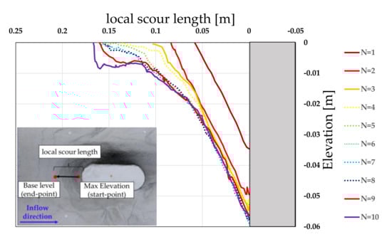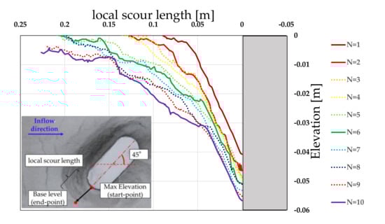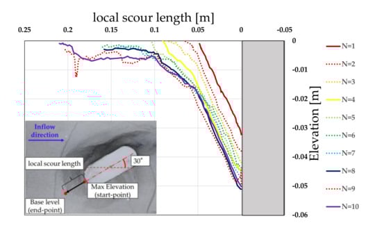 Figure 20 shows the evolution of the cross-sectional shape of the local scour hole upstream of the pier model in Case 6. It can be observed that the shape of the local scour hole increases as an inverted cone from the first to third repetition for Type 1 model. The results were consistent with the previous studies [,]. From the fourth to sixth repetition, the erosion of the surface layer progressed as if the upper part of the local scour hole, which had developed as an inverted cone by the third repetition, was removed. Furthermore, from the seventh to the tenth repetition, in addition to the local scour hole formed by the sixth repetition, the surface of the soil layer was further eroded. Figure 21 shows a detailed view of the upstream scour cross-section of Case 6 at the end of the tenth iteration. The broken line in this figure shows an approximation of the actual local scour hole at a point where the angle changes significantly. It can be seen that the initial slope angle of the local scour hole changed to 28.7°, 13.5°, 9.7°, and 2.3° with increasing local scour. The slope near the maximum scour depth was approximately the same as the angle of repose in water. The slope angle at the top of the local scour hole was smaller than the angle of repose in water, and the angle decreased as the slope moved upward. The red line in Figure 21 shows a straight line connecting the beginning and end of the local scour extension having an angle of 13.9°. The local scour length can be calculated from Equation (1) using the angle of repose of the riverbed material in water, Φ. However, Figure 21 shows that when the local scour length was calculated through Equation (1) under the condition that the water level iteratively rises and falls in Case 6, the angle of the straight line connecting the start and end points of the local scour length, 13.9°, was used instead of the angle of repose in water (26.1°). Further, the actual local scour extension in Case 6 was approximately twice as long as the local scour extension calculated using the angle of repose in water. The same tendency was observed in Cases 2 and 7, where the water level history was iterated using Type 1 model.