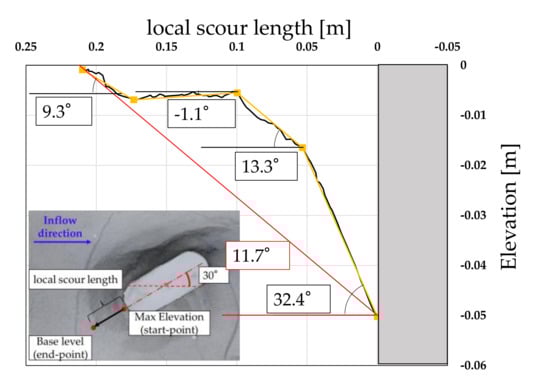 Figure 25 shows a representative detailed view of the local scour section at the end of 10 iterations for Case 13, where the broken line indicates the approximation of the actual local scour hole at the point where the angle changes significantly. It was observed that the slope angle of the scour hole changed from the beginning of the scour extension to 32.4°, 13.3°, −1.1°, and 9.3°. The slope angle near the maximum scour depth was approximately the same as the angle of repose in water. The angle at the top of the local scour hole was smaller than the angle of repose in water, and the angle decreased approaching the top of the local scour hole. Contrasting to the local scour cross-sections of the cylindrical specimen and the oval specimen with θ = 0°, it was evident that shallow shelf-like local scour holes were formed near the soil base. The red line in the figure is a straight line connecting the start and end points of the local scour extension having an angle of 11.7°, which was 2.4 times longer than the scour extension calculated using the angle of repose in water.