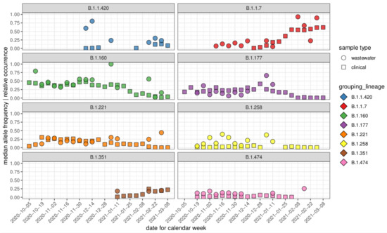 Comparison of median allele frequencies of signature mutations in wastewater samples (circles) to relative occurrence of lineages in clinical samples (squares) after 1 October 2020. Lineages with at least 3 signature mutations and at least 80 associated clinical samples are shown. Samples are grouped per calendar week, and each point represents at least 1 signature mutation detected in 1 sample.