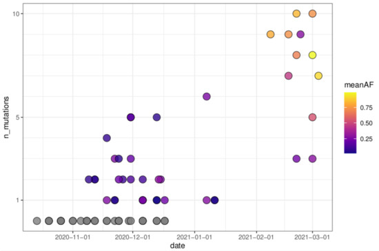 A primary interest in the monitoring of wastewater samples is screening for the novel variants of concern. Particularly, lineage B.1.1.7 was of primary interest during the sampled interval. For several samples, we observed that an increasing number of signature mutations of B.1.1.7, at low frequencies, could be detected already in November (10 distinct mutations, mean allele frequency (: 0.14) and December (6 distinct mutations, : 0.17) 2020 before the first clinical isolate assigned to the lineage in Luxembourg on 24 December 2020 (Figure 3, Figure 4, Supplementary Data S5). During the period where B.1.1.7 emerged as the dominant lineage circulating in Luxembourg (February, March 2021), a larger number of samples allowed for the detection of signature in the wastewater samples, as well as at higher allele frequencies.