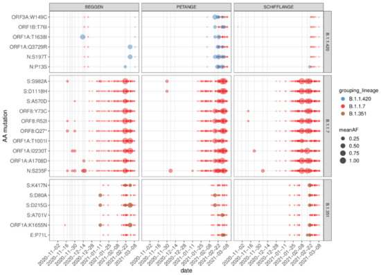 Additionally, sublineages were grouped to reduce complexity. Sequences not assigned to a “B” lineage were grouped to the first level (“A”, “C”, “P”), and all “B” sub-lineages except “B.1.1.X” were grouped (e.g., B.1.177.77 was grouped with B.1.177 and B.1.160.28 was grouped with B.1.160). In addition, for grouped lineages, unique signature mutations were determined and utilized as markers to compare allele frequencies. We focused on the most common lineages with sufficient representation in signature mutations (at least 3), in genome sequences from SARS-CoV-2 positive individuals in Luxembourg: B.1.1.420, B.1.1.7, B.1.160, B.1.177, B.1.221, B.1.258, B.1.351 and B.1.474.