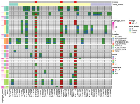 Focusing on B.1.1.7 specific haplotypes, we determined ranges in 19 samples between positions 27,737 and 28,484 including up to three signature mutations (Figure 5): C27972T (ORF8:Q27*), G28048T (ORF8:R52I) and A28111G (ORF8:Y73C). In samples of earlier time points (November and December 2020), these signature mutations can sometimes already be detected, but they do rarely occur in the same predicted haplotypes. Additionally, the haplotypes containing early B.1.1.7 signatures are predicted at lower scores reflecting a lack of evidence in counts of SNP co-occurrence, which can also be caused by the low abundance of these haplotypes.