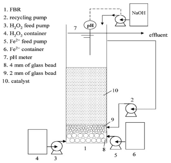 In this research, activated carbon, manganese dioxide, and self-synthesized manganese dioxide/iron oxide composite were used as the treatment supports to compare their performances in the treatment of wastewater containing COD and boron. The self-synthesized manganese dioxide/iron oxide composite was synthesized by continuous dosing. The particle size of manganese dioxide was set as 500 μm to calculate the required concentrations of ferrous iron and hydrogen peroxide. Then, H2O2 and FeSO4 were successively added to the bottom of the reactor. A schematic diagram of the synthesis device is presented in Figure 1. All experiments were carried out at room temperature (24 ± 4 °C). Before using the peristaltic pump for continuous dosing, the pumping flow was determined. An air pump was used for providing the required airflow to maintain the reaction in a fluidized bed reactor in good condition to avoid precipitation. The reaction height of the fluidized bed should be 50%. Further, a pH control unit was used to control the pH at the required level to ensure continuous synthesis for 7–12 days. FeOOH was the main type of iron oxide.