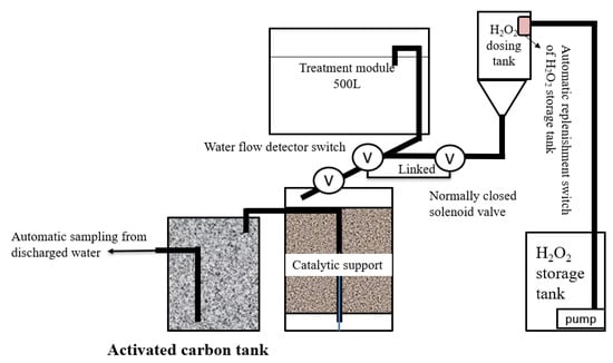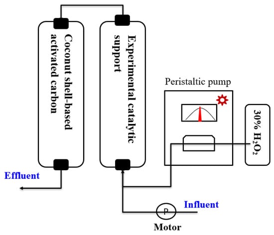 Before practical application, various catalytic supports were individually conducted pipe string tests on a laboratory scale (Figure 2). First, the configuration was optimized; then, the self-designed low-energy siphon treatment system was used to continuously test the small-scale treatment system for practically discharged industrial wastewater. The changes in the treatment efficiency were recorded, as shown in Figure 3. After sampling, the samples were divided into the COD test group and boron test group and tested by using the Merck prove 600 spectrophotometers. Next, the obtained data were used to analyze the samples. Merck’s COD Cell Test (Product Number 1.18753) was adopted for making COD and Boron analyses. The potassium dichromate close reflux method and spectrophotometer were used to test and analyze COD. Boron cell Test (Product Number 1.00826), The Boron method applied in weakly acidic solutions borate reacts with azomethine H to form a yellow compound that is determined photometrically.