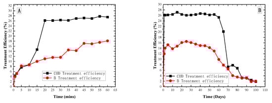 In this research, the required concentration (COD: 22,500 mg/L; boron: 50 mg/L) of wastewater was prepared independently in the laboratory and treated in oxidation and adsorption methods. Then, an exploration was conducted on the treatment performance of activated carbon and manganese-iron support for individual adsorption and that of oxidant for oxidation. Finally, the adsorption and oxidation combined method was adopted to explore its efficiency in the treatment of practical industrial wastewater. Specifically, pure activated carbon was used to adsorb COD and Boron in the wastewater. As shown in Figure 4A, the COD treatment efficiency of this method was only about 26% and the adsorption saturation was reached after 20 min, while the boron adsorption efficiency was lower than 20% and the treatment speed was quite low. After reaching the adsorption saturation, the activated carbon was reproduced for the retreatment test repeatedly. As illustrated in Figure 4B, the treatment capacity of this method began to reduce from the 60th day, reached 50% on the 70th day, and became zero on the 100th day.