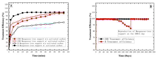 Regarding the removal of boron from wastewater, the treatment efficiency of the former combination was about 70% at most, while that of the latter combination was up to 95% in the early 10 min and reached 100% within 20 min. This result revealed that after subjecting to oxidation, the boron in wastewater was partially converted into borate, which could be further adsorbed by activated carbon simply. As can be observed from the test result of the long-term combined use of manganese-iron support and activated carbon (Figure 6B), during the supply of oxidant, manganese-iron support as a catalyst has a continuous oxidizing ability and thus continuously has high efficiency in removing the COD in boiling water. As for boron, it was mainly adsorbed by activated carbon. When being used in combination with manganese-iron support, activated carbon underwent a reduction in the treatment load so that its effective treatment efficiency was maintained for up to 180 days and its high treatment efficiency was restored after reproduction.