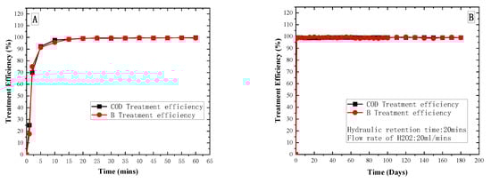 In the practical research, a self-built automation module and self-synthesized manganese-iron support were used for the practical treatment of industrial wastewater, with a daily treatment capacity of about 5CMD. The wastewater contained COD (14,700 mg/L) and boron (48.6 mg/L). After being tested in the laboratory, the parameters were optimized and H2O2 was added at an inflow rate of 20 mL/min. In the modified method, the removal rates of COD and boron reached 100% within 15 min (Figure 7A) and the optimum treatment efficiency lasted for 180 days (Figure 7B).